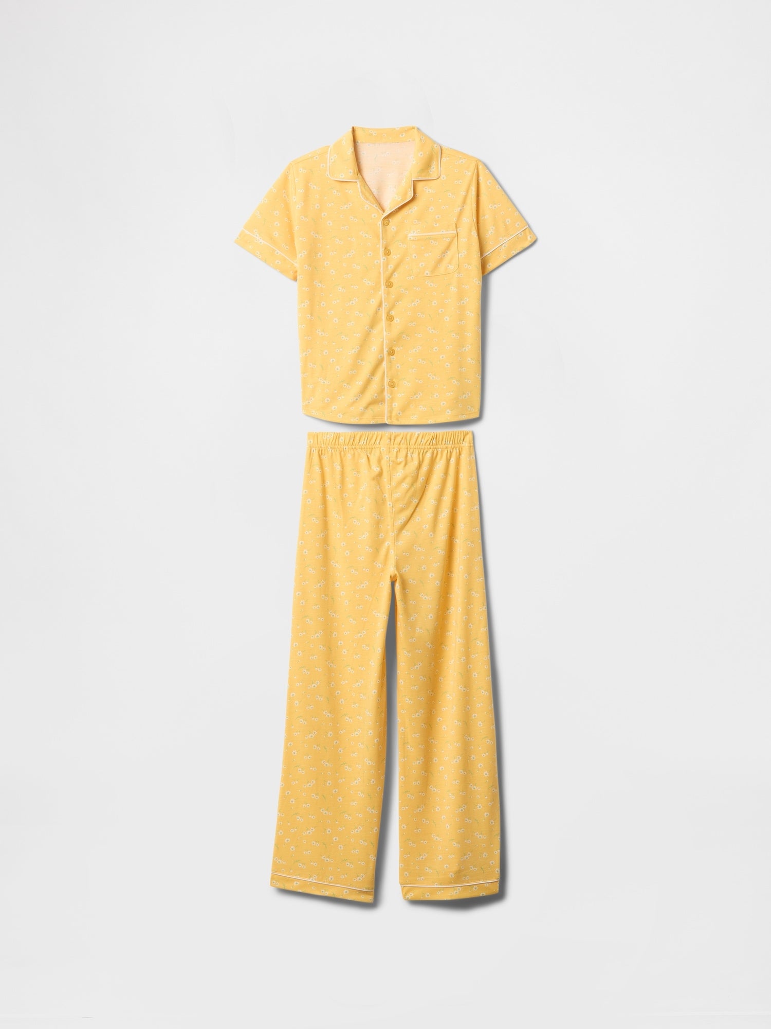 This PJ Set is made with 100% recycled polyester. Compared to virgin materials, using recycled materials helps to reduce resource use and waste.