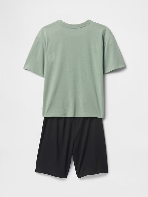 This PJ set is made with 100% recycled polyester. Compared to virgin materials, using recycled materials helps to reduce resource use and waste.