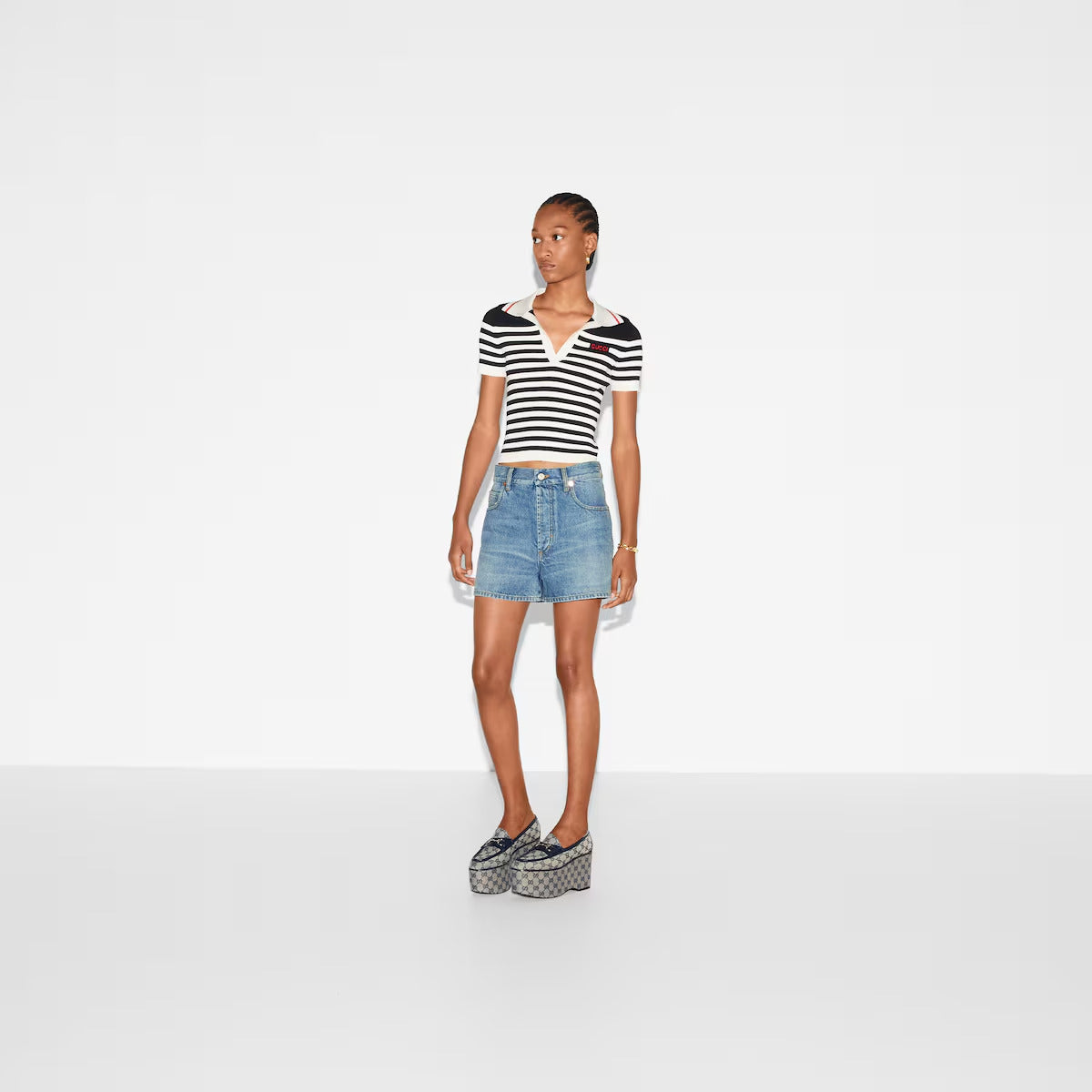 Inspired by the summer spirit and beach clubs on the Italian coast, this item is part of Gucci Lido. Garden-inspired palette, floral prints, and sophisticated lightweight materials are a prelude to the warmer weather. These straight-cut shorts are presented in blue washed denim and feature a slim Horsebit detail, paying homage to the House’s rich equestrian heritage.
