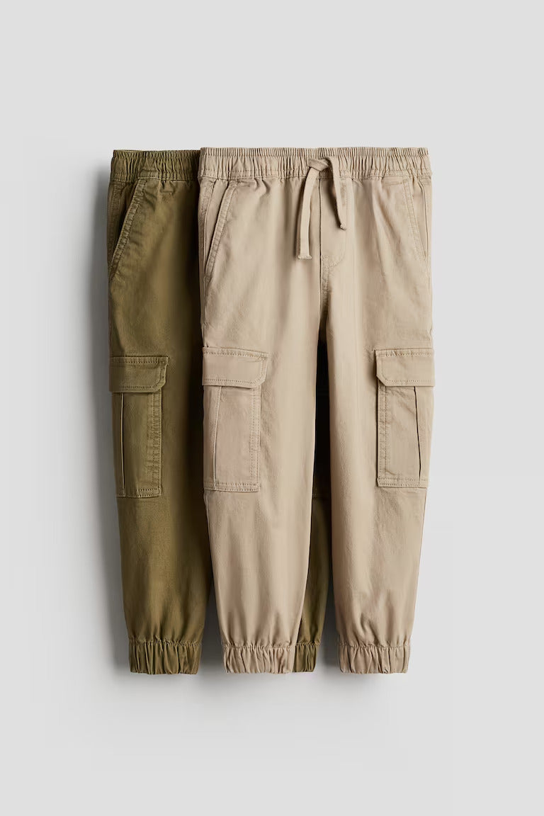 Relaxed-fit cargo joggers in cotton twill. Elasticized, drawstring waistband, mock fly, and elasticized hems. Diagonal side pockets, a mock back pocket with flap, and leg pockets with flap.