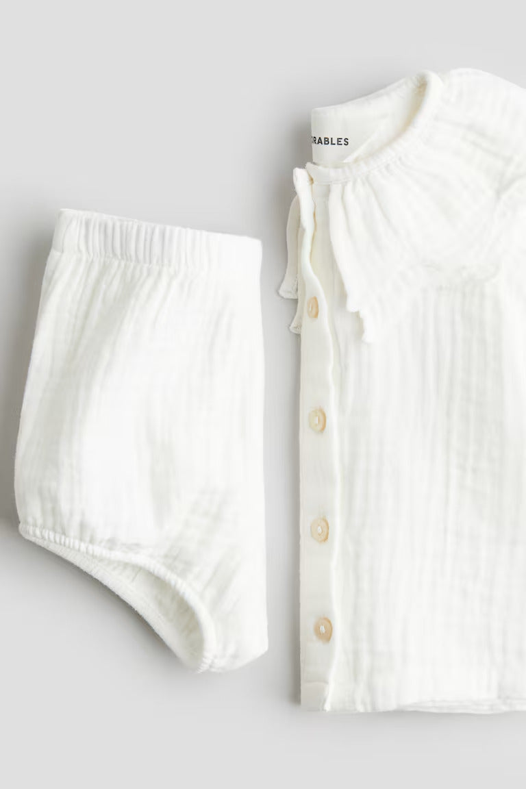 H&M Adorables. Set in soft, high-quality cotton muslin with a blouse and bloomers. Blouse with a double-layered collar with scalloped, overlocked edges, buttons at front, and short puff sleeves with narrow, covered elastic at cuffs. Bloomers with an elasticized waistband and soft, narrow elastic at leg openings. The H&M Adorables collection is a curated selection of high-comfort, quality pieces with a timeless appeal.