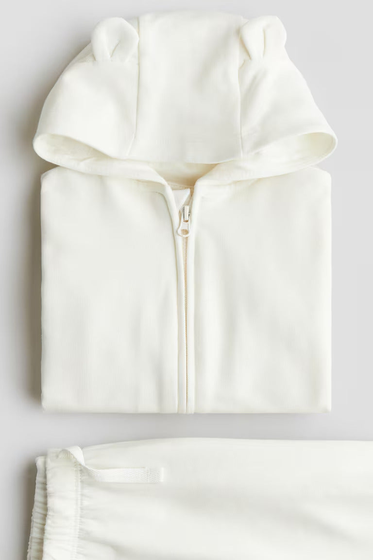 Set with a hooded sweatshirt jacket and sweatpant joggers in cotton with a soft, brushed inside. Jacket with a lined hood, zipper at front, gently dropped shoulders, and ribbing at cuffs and hem. Joggers with elasticized, drawstring waistband and elasticized hems.