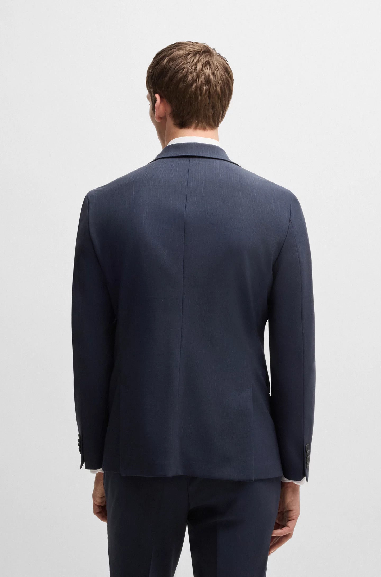 A dynamic suit by BOSS Menswear. Tailored to a defined fit for a neat profile with softly constructed shoulders, this two-piece ensemble is crafted in a wool-rich blend with performance-stretch qualities including wrinkle resistance. The fabric has a subtle pattern for versatile styling.