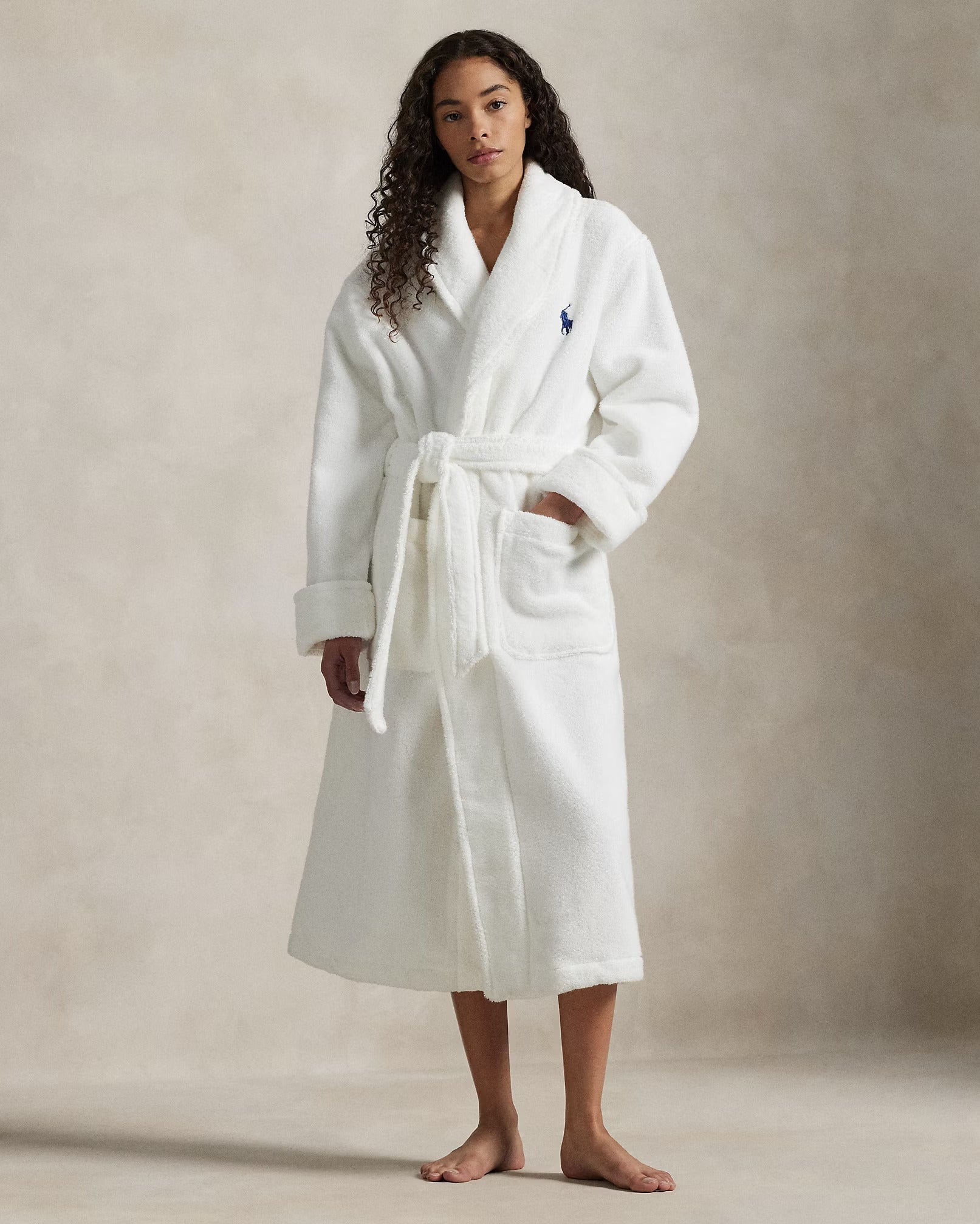 This plush cotton terry robe has an enveloping shawl collar and self-belt at the waist. A vintage-inspired Polo Bear is featured at the back with our signature logo.